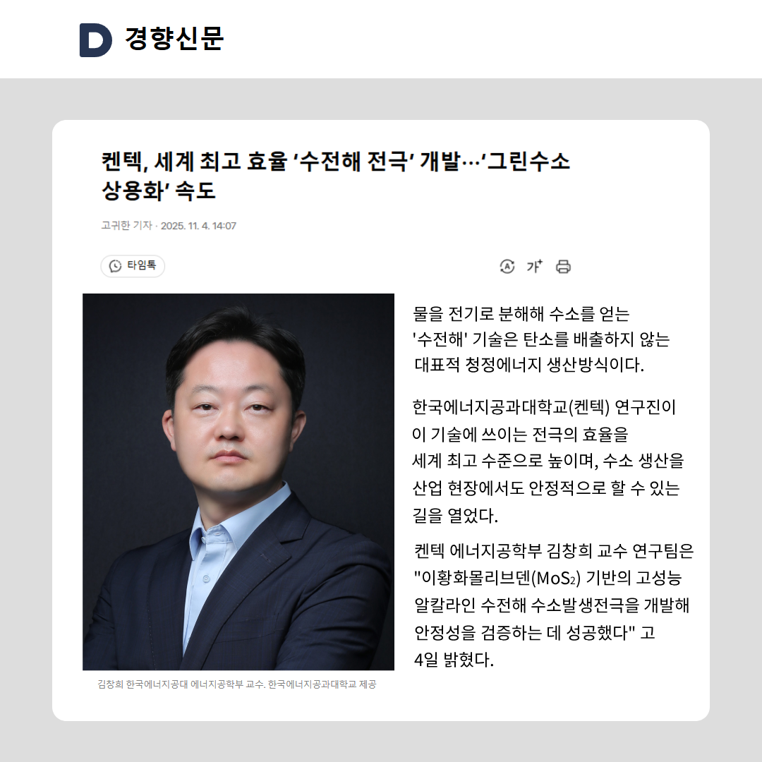 Water Electrolysis Lab (WE Lab) for Green Hydrogen School of Energy Technology Hydrogen Energy Members Water Electrolysis Lab (WE Lab) for Green Hydrogen School of Energy Technology Hydrogen Energy Research 0 / 0 Water Electrolysis LabWE Lab Youtube Water Electrolysis LabWE Lab News MORE 2025 November 4 | 켄텍, 그린수소 효율·안정성 기술 개발…세계 최고 효율 달성 2025-11-04 2025 November 4 │켄텍, 세계 최고 효율 '수전해 전극' 개발··· '그린수소 상용화' 속도 2025-11-04 2025 October 30~31│ Clean Hydrogen and Ammonia Symposium 2025-11-07 2025 September│ Fraunhofer IFAM, Dresden, Germany 2025-09-29 2025 August 14th│ Graduation Ceremony : Junseok Oh 2025-09-10 Water Electrolysis LabWE Lab Publications & Projects PAPER PATENT Funded Research Technology Transfers