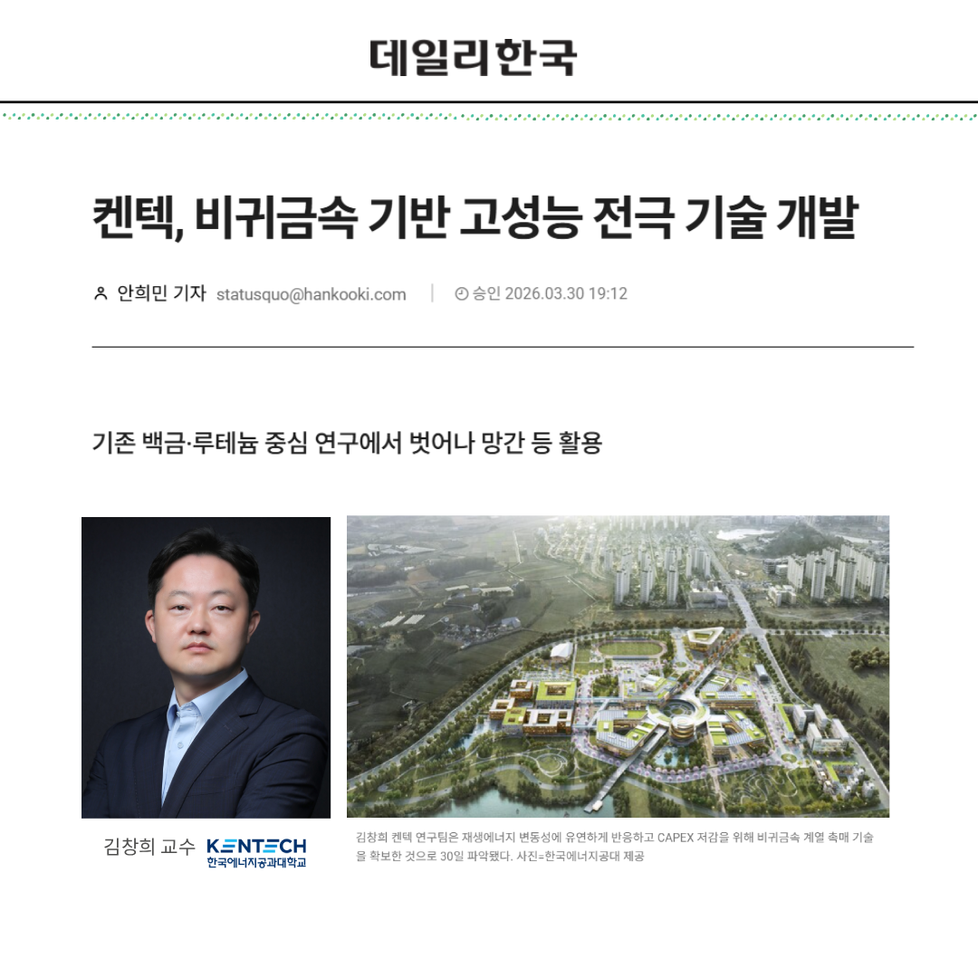 Water Electrolysis Lab (WE Lab) for Green Hydrogen School of Energy Technology Hydrogen Energy Members Water Electrolysis Lab (WE Lab) for Green Hydrogen School of Energy Technology Hydrogen Energy Research 0 / 0 Water Electrolysis LabWE Lab Youtube Water Electrolysis LabWE Lab News MORE 2026 April│ Cherry Blossom Viewing 2026-04-02 2026 March 30│Professor Changhee Kim’s Presentation Featured in Daily Hankook 2026-03-31 2026 March 26th ~ 27th│ 2026 Green Hydrogen Power To Gas Symposium in Donghae, Gangwon-do 「그린수소 P2G 심포지엄」 2026-03-28 2026 February 27│ Graduation Ceremony : Seojun Son, Minju Kim, Jinhyun Kim 2026-03-02 2026 February 4th ~ 6th│ 2026 Water Electrolysis Workshop in Jeju 「제주, 수전해 워크숍」 2026-02-08 Water Electrolysis LabWE Lab Publications & Projects PAPER PATENT Funded Research Technology Transfers