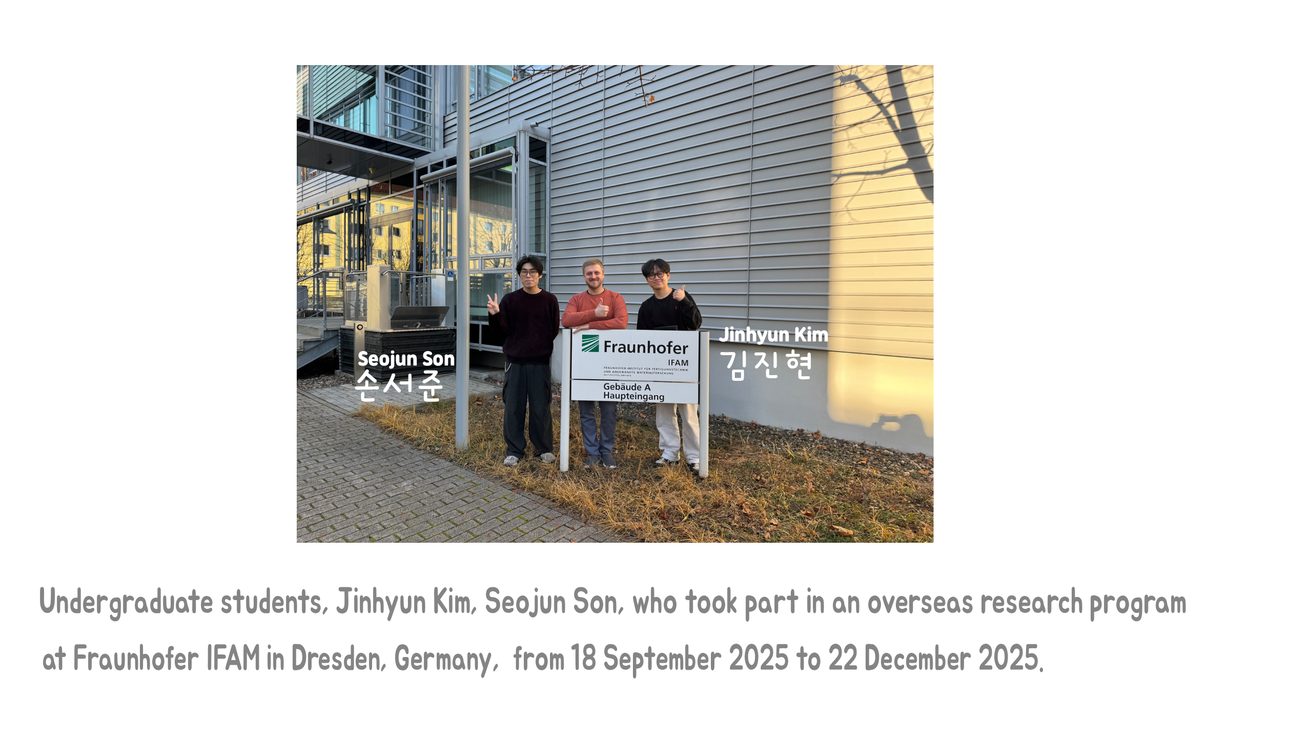 2025 September 18th ~ 2025 December 22nd│Undergraduate students in an overseas research program at Fraunhofer IFAM in Dresden, Germany 2026.02.01 17:55 다음글 : 다음글이 없습니다. 이전글 : 2025 November 26│ MOTIE launches the ‘Ultra‑Innovation Economy Green Hydrogen Project Task Force「초혁신경제 그린수소 프로젝트 추진단」출범 목록